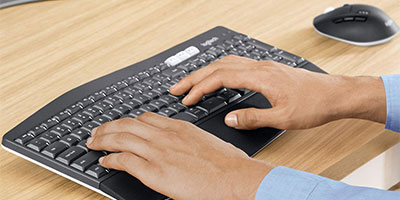 The oversized, cushioned palm rest and curved keyframe gives you support for all-day typing. Adjustable tilt legs offer the perfect typing angle. And the contoured design and soft rubber surface of the mouse fits comfortably in your palm.