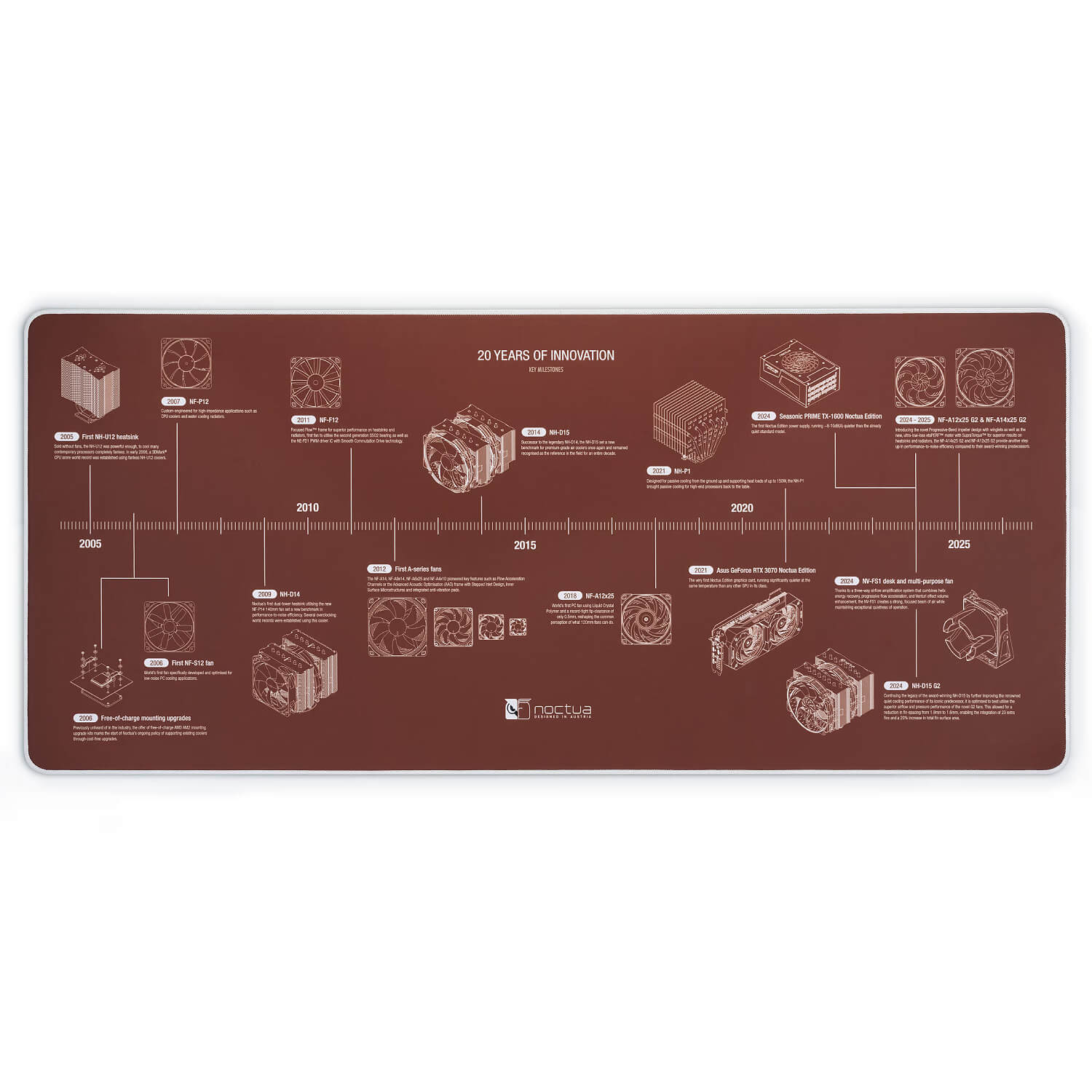 • עיצוב ציר זמן – מציין מוצרים מרכזיים של Noctua משנת 2005 ועד 2025.