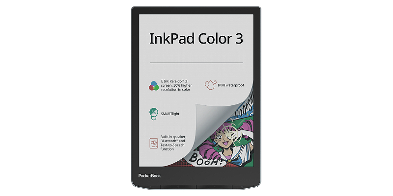 ספר אלקטרוני InkPad Color 3 PB743K3-1-WW מבית PocketBook, עם מסך צבעוני בגודל 7.8 אינץ', רמקול מובנה, Bluetooth, עמידות במים בתקן IPX8 ופונקציית Text-to-Speech מקריאה בקול כל קובץ טקסט ב-26 שפות. תמיכה בשפות - עברית / אנגלית / ערבית / רוסית / אוקראינית.